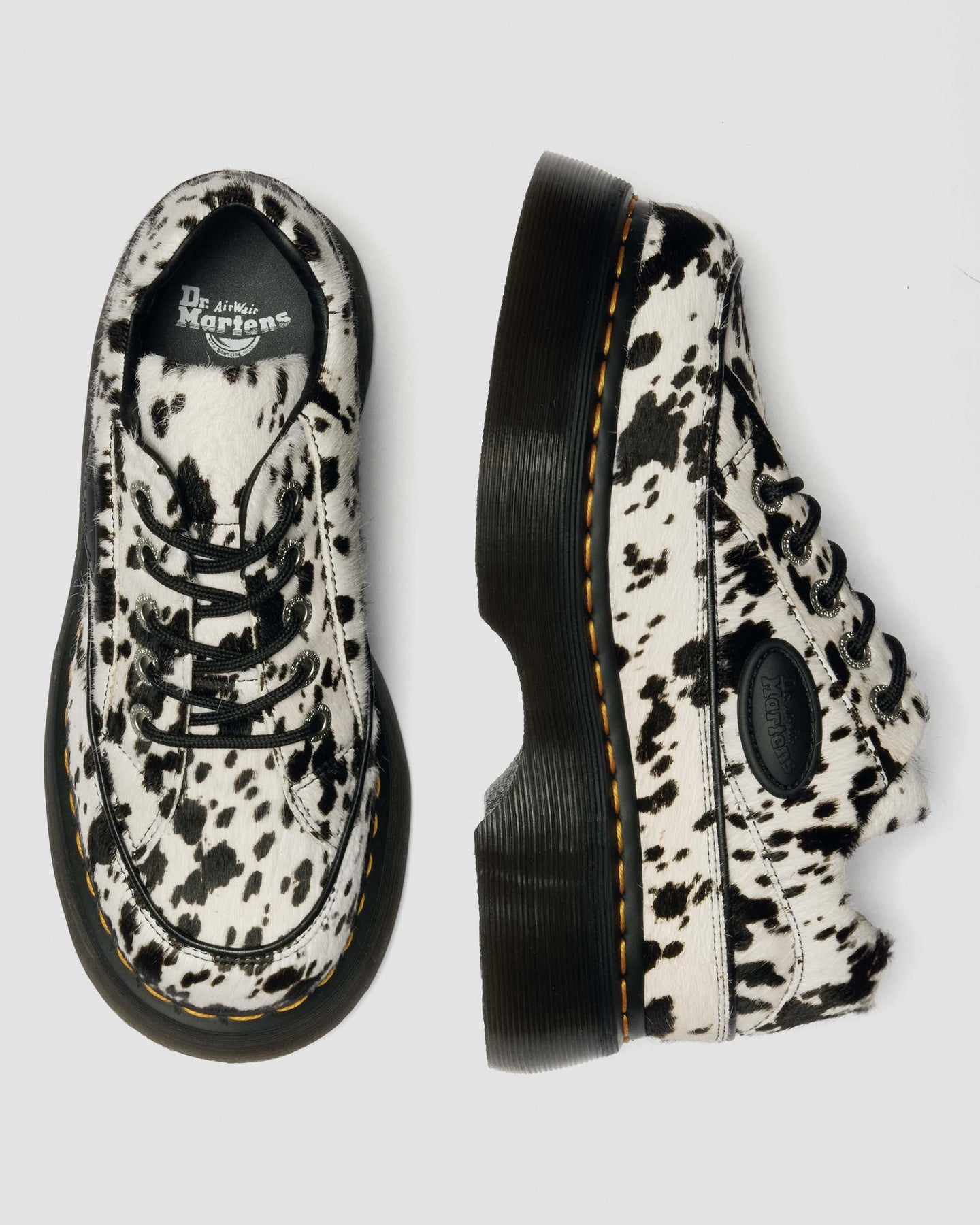 The Buzz 5i shoe puts a spotted spin on 90s archive energy. Crafted in Dalmatian Hair-On leather with black cord laces through silver eyelets. From the padded collar to the contrast stitching and inflated rubberised badge, these shoes make mischief with every step. Anchored on the chunky barrel-edge Buzz sole with DM’s grooving, yellow welt stitch, and leaf-patterned undersole.