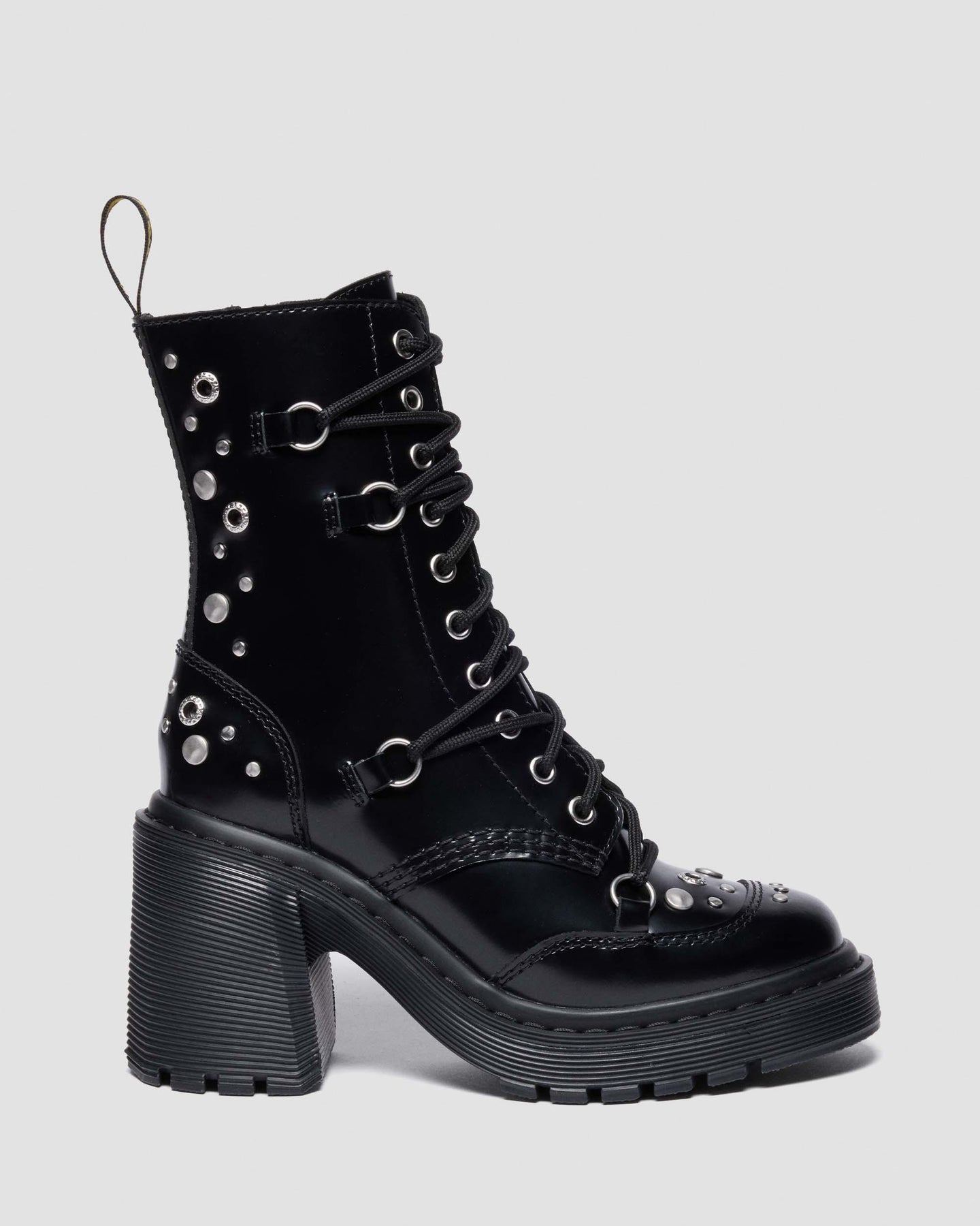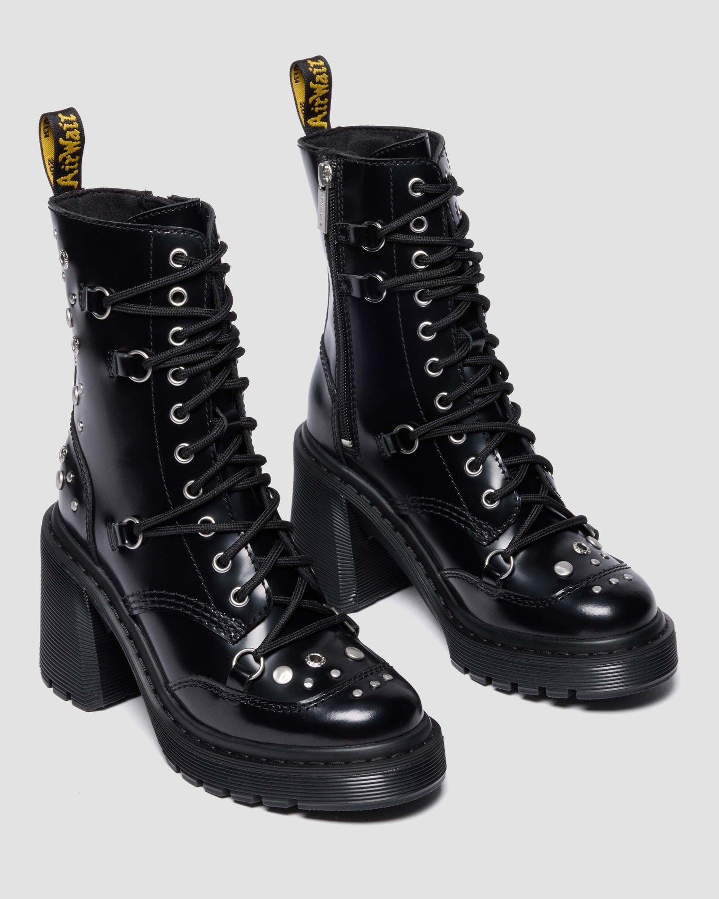 Add an unexpected edge to any outfit with our studded Chesney boot. A contemporary silhouette redesigned with unrestrained rivets, studs, and hardware for an alternative angle. Cut from soft-to-touch Buttero leather that’s strong enough to go the distance. Our 10-eye boot can be custom-laced with the additional D-rings for a personal touch. Set on a flared heel sole and secured with a black-on-black welt stitch. Each pair is finished with our unmissable AirWair heel loop.