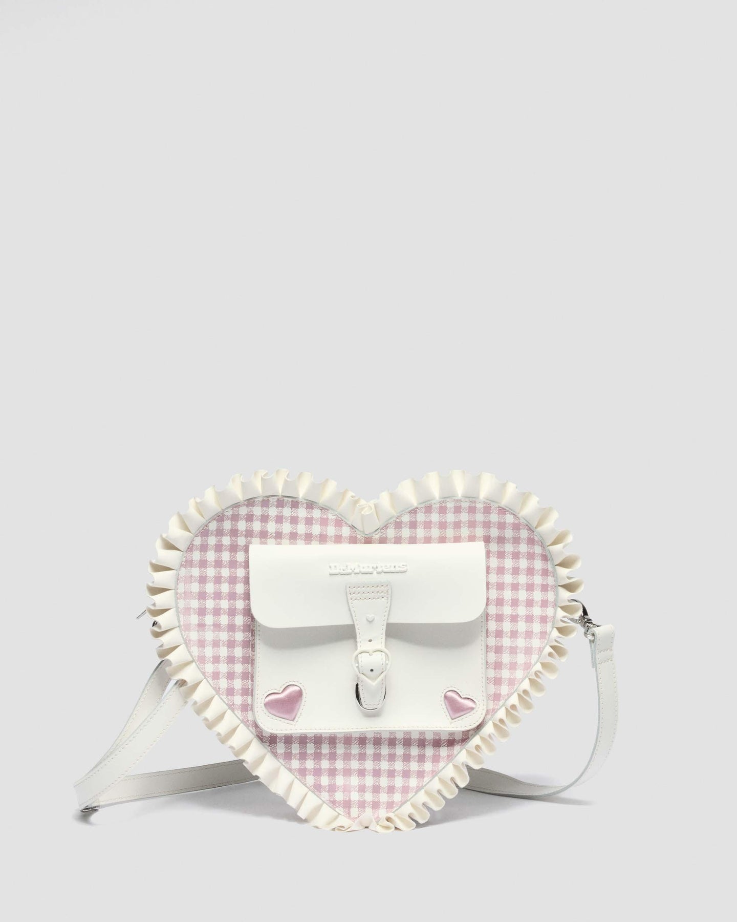 The pairing of hearts and durable Doc’s leather is a key signature of our archival pieces. Updated in white Smooth leather with dusty rose gingham accents, this backpack balances playful detailing with polished design. Embroidered pink hearts, subtle frill trim, and crisp white hardware give it personality without excess. Two compartments keep your essentials organised, while bold DM’s metal lettering and signature touches anchor it firmly in our DNA.