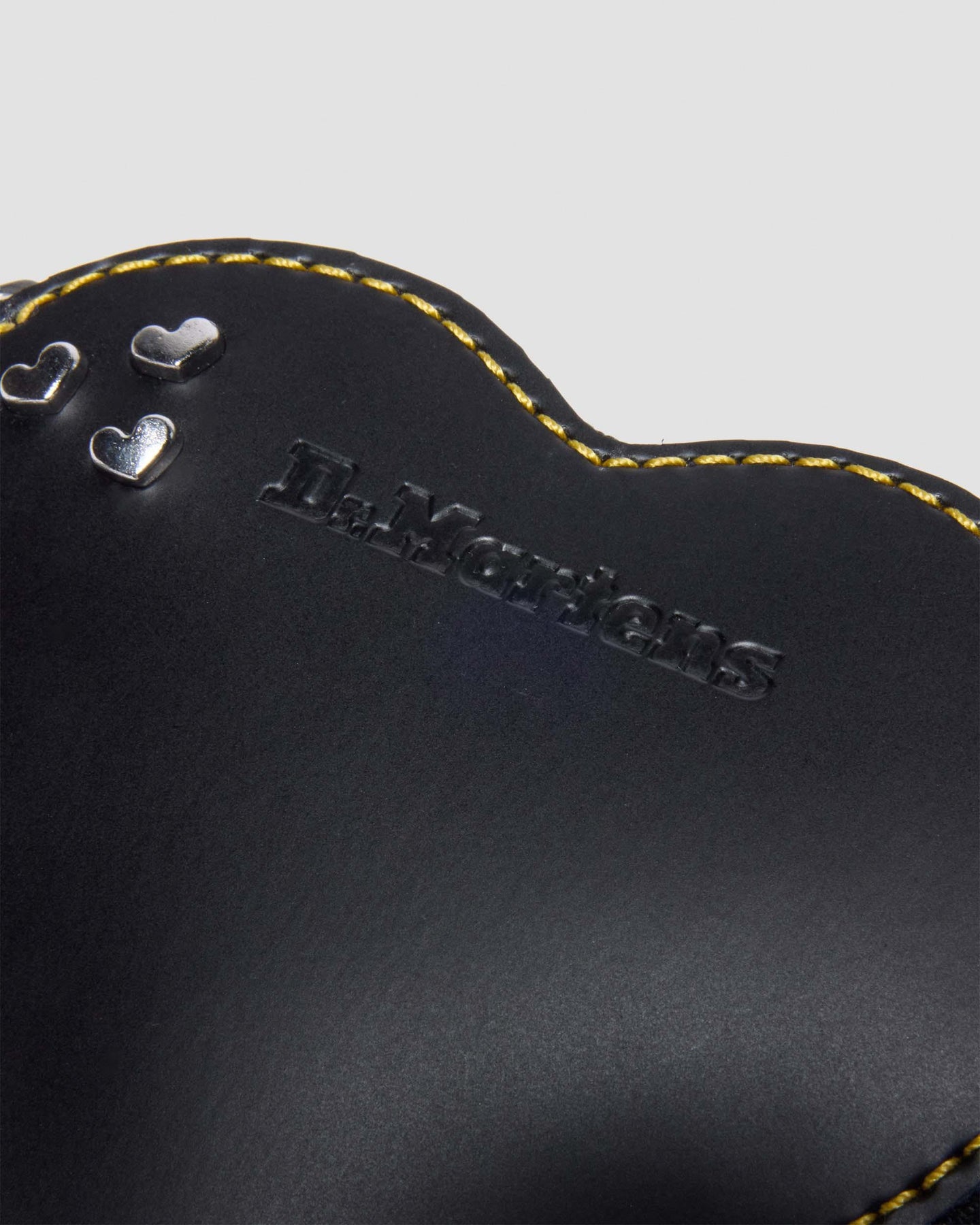 Heart-shaped and heavy-duty. The Heart Key Ring Purse plays with shape and reinforces it with renowned DM’s durability. Crafted from rigid Kiev leather, a coated version of our classic Smooth leather with a slight sheen finish, this purpose-built silhouette holds smaller items and can be used as a bag charm. Decorated with a contrasting silver zip, attachment ring and clasp, and heart studs. It is finished signature DM’s markings: a central logo, detachable woven AirWair wrist strap and yellow stitching.