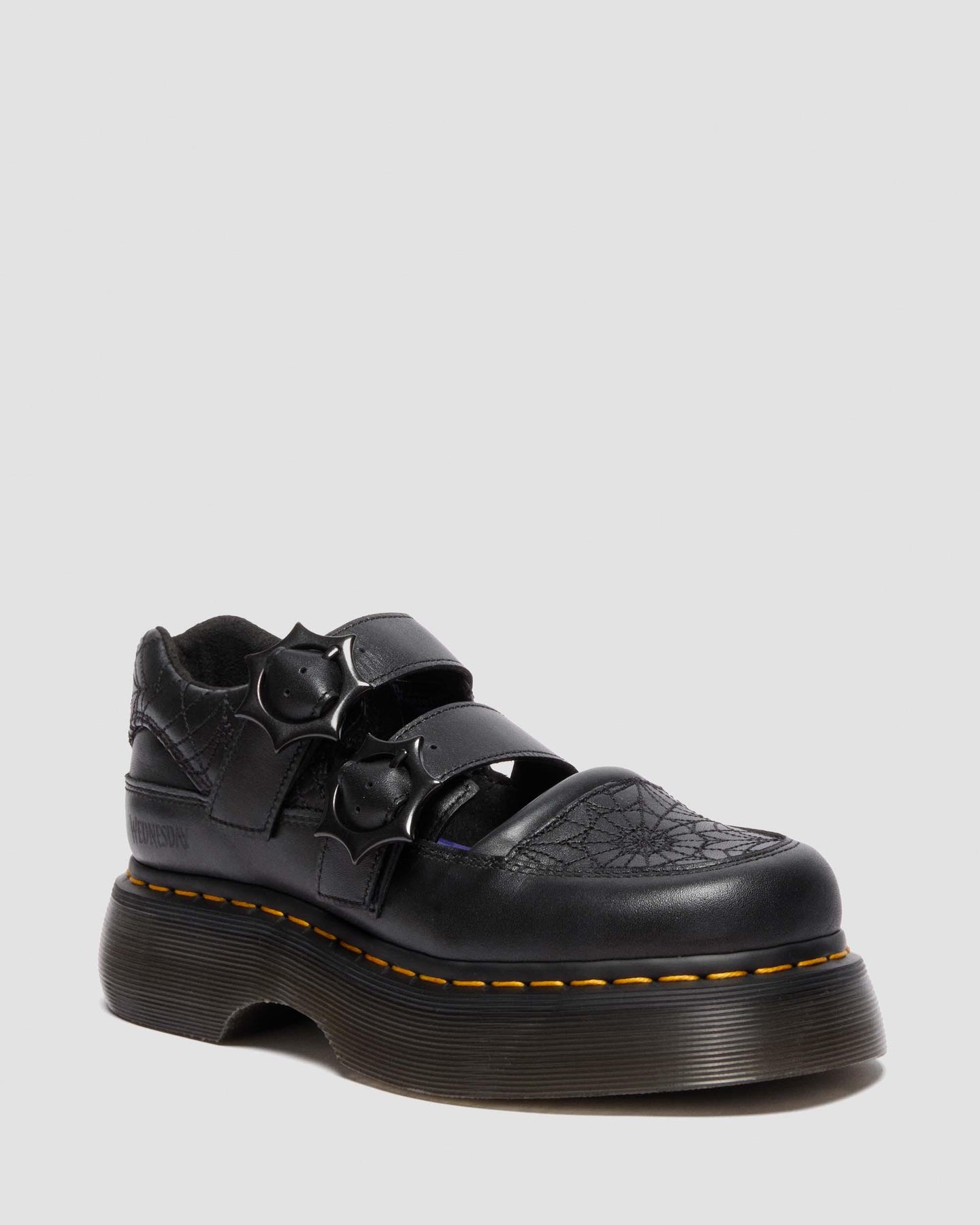 Not your average Mary Jane. This limited-edition silhouette from the DM’s x Wednesday collection takes a gothic classic and gives it a twisted edge. Crafted from a tactile mix of Nappa and Lux leather, the shoe is embroidered with stained-glass-inspired detailing - a nod to the dorm room windows at Nevermore Academy. The heel is debossed with the Wednesday logo, while the custom buckle design reflects the sharp, distinctive aesthetic of the series. Finished with our classic yellow welt stitching and set on an exaggerated, empowering sole.